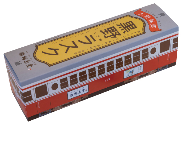 名鉄電車をイメージしたパッケージに、黒糖味のラスク10枚が入った「黒野ラスク」(1,000円相当)1箱を店頭にてお引き換えいただけます。
